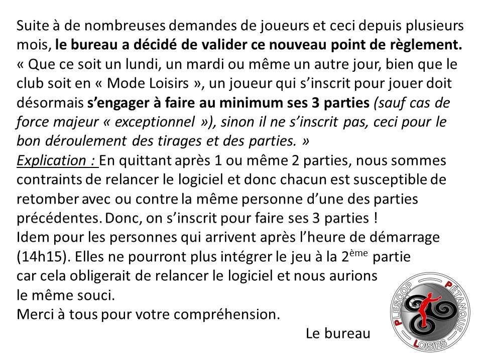 Tout le monde s'engage à jouer au moins 3 parties à chaque fois.